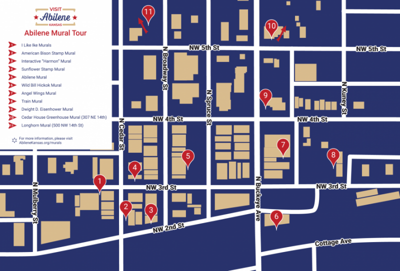 Abilene is home to a variety of beautiful murals, and nearly all are visible from the comfort of your car. Check out this handy mural map or visit our website www.AbileneKansas.org/murals to learn more.