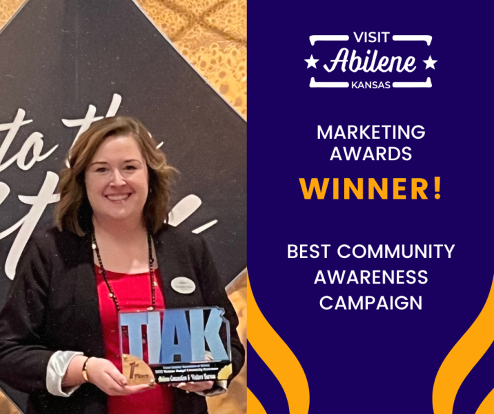 The Abilene Convention & Visitors Bureau received a Travel Industry Association of Kansas (TIAK) marketing award at the Kansas Tourism Conference in Wichita. Abilene received the Destination (Community) Awareness Campaign Award for the Medium Community Marketing Budget category. Other communities in the Medium Community Marketing Budget Category include Emporia, Manhattan and Meriam.